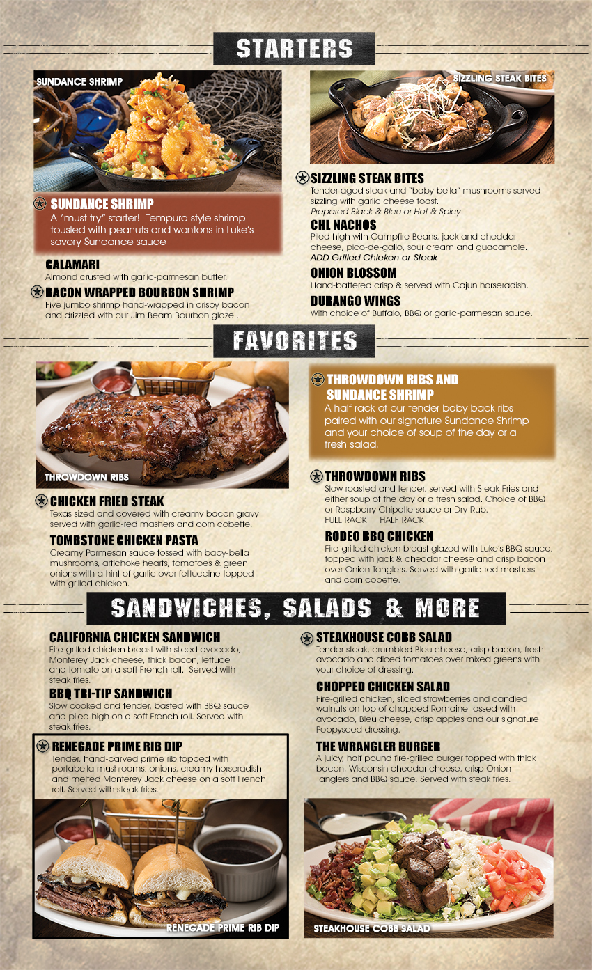 Transport yourself to the untamed era of cowboys and cowgirls with every appetizer, entrée or dessert on the Cool Hand Luke’s Steakhouse menu. Our lunch and dinner menus are designed to tantalize your taste buds with an array of mouthwatering options. We encourage you to indulge in our signature steaks, perfectly grilled to juicy perfection. If ribs are your weakness, then prepare yourself for our slow roasted and tender Throwdown Ribs. For those seeking lighter fare, our salad selection is second to none – crisp greens, topped with tender proteins and complemented by flavorful dressings. No matter what you’re craving, our Cool Hand Luke's Steakhouse menu invites you to savor each moment, unlocking the spirit of the Wild West one bite at a time.